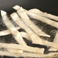 1/4 inch strips from 2 corn tortillas. Place in hot oil and fry until golden. If they brown they are overdone. If they brown really fast the oil is too hot. Remove from oil and place on a paper towel. Sprinkle with salt to taste. Set aside