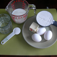 milk 3/4 C cold water 3 egg yolks 1 T sugar 1 C (5oz) flour